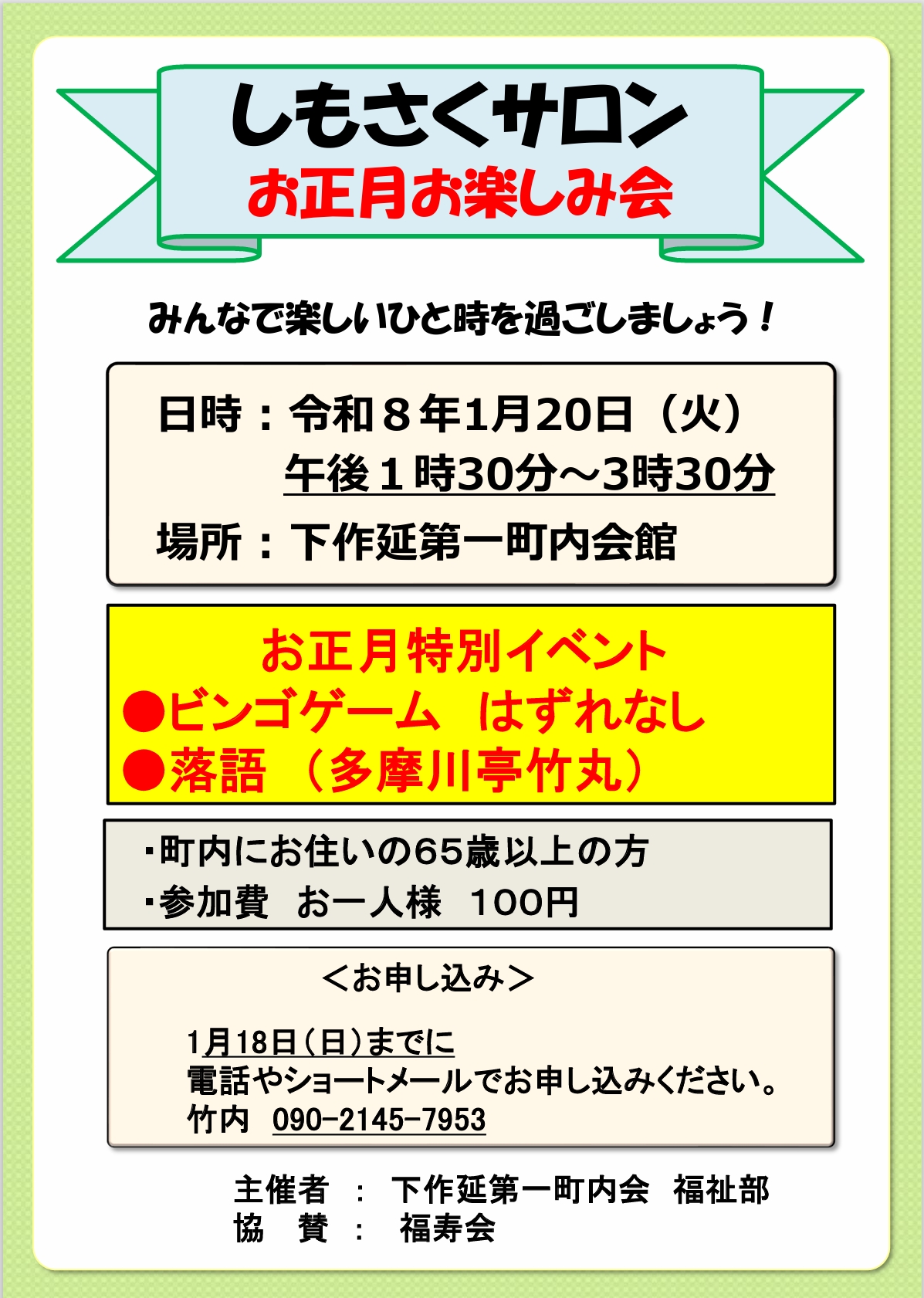 サロンの詳細は次の通りです。申込みは1月18日(日)までに当町内会の竹内までお電話(090-2145-7953)ください。
